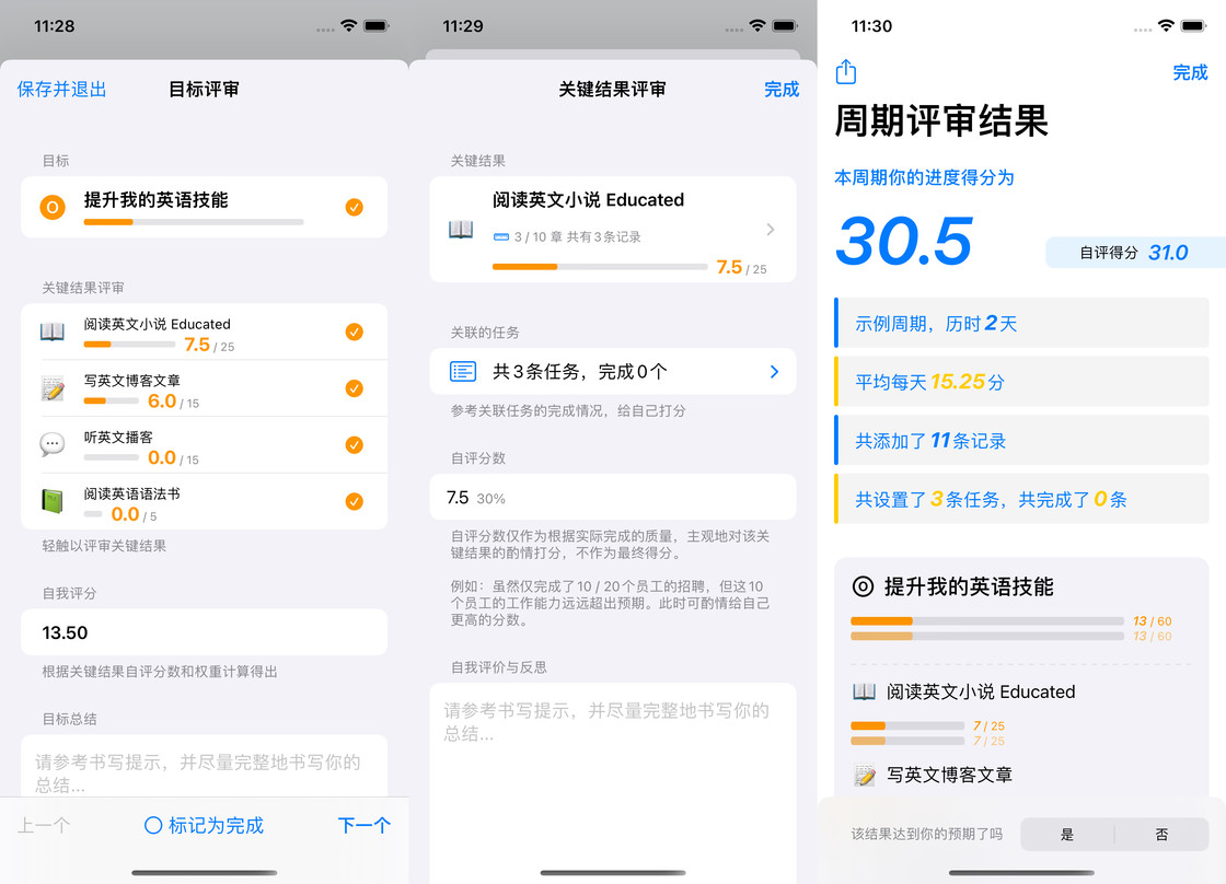 在 2.3 版本的周期评审中,我们主要围绕着用户实际的进度得分,通过制定的任务的完成情况,给自己的每个关键结果书写评价总结,并给出一个自我评分。